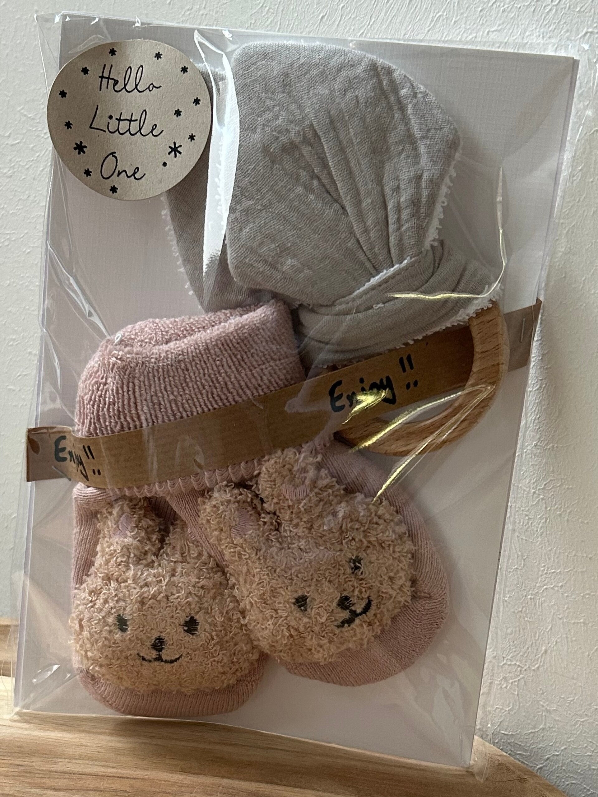 Dit schattige cadeaupakketje bevat zachte baby0sokjes en een bijtring. Perfect voor de allerkleinsten. Een leuk en praktisch cadeau voor elke baby!