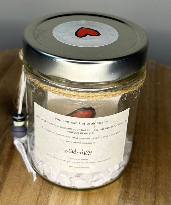 In dit glazen potje zitten kleine kaartjes waar je een lieve wens voor het bruidspaar kunt achterlaten. Een prachtig en persoonlijk element voor op de tafel tijdens een trouwreceptie