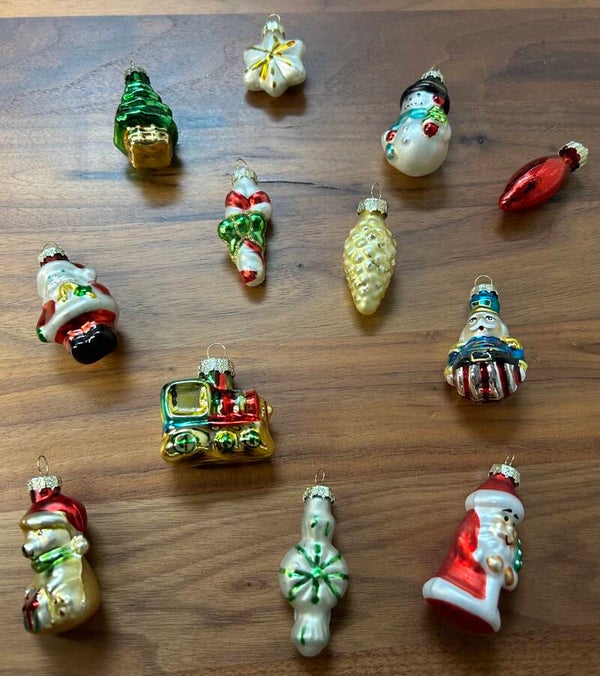 Retro kerstboomversiering in klein formaat, net zoals vroeger. Breng nostalgie in je kerstdecoratie met deze authentieke sfeervolle ornamenten. (hele set)